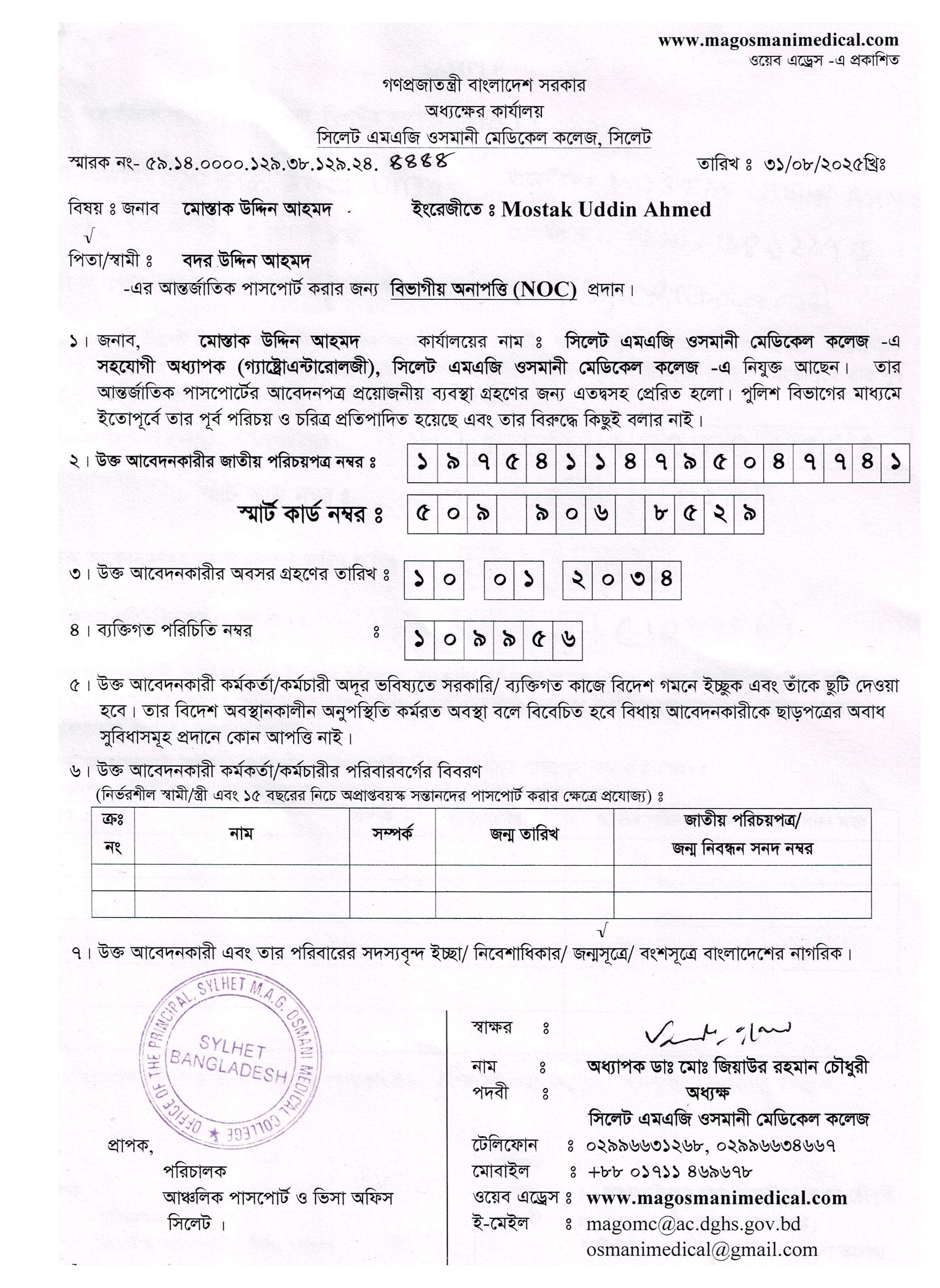 NOC of Dr. Mostak Uddin Ahmed